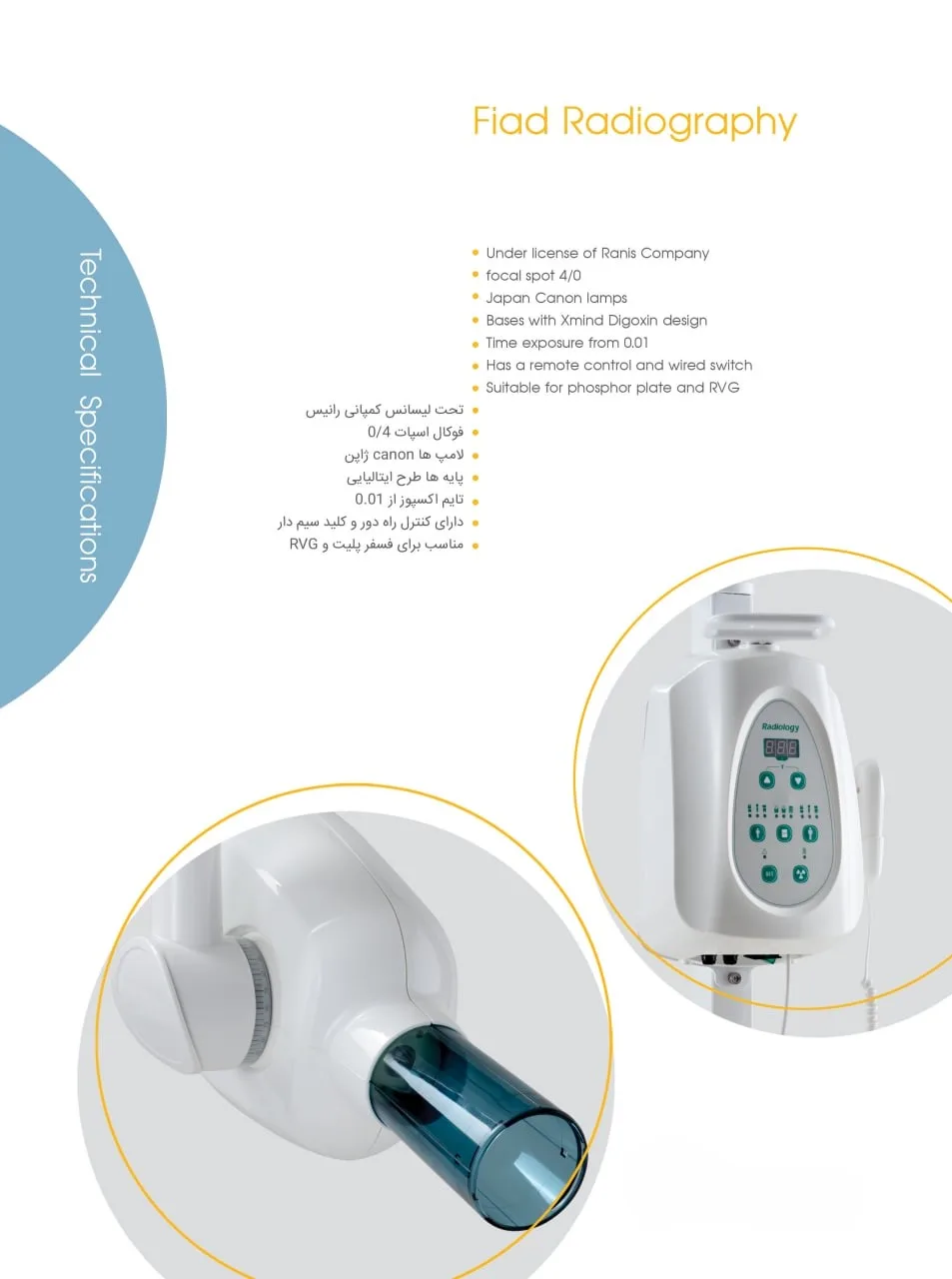 رادیوگرافی فیاد ساخت کلمبیا است و دارای پایه ریموت کنترل باکیفیت ساخت ایران میباشد. از دیگر ویژگیهای این دستگاه به تایم تاخیری اکسپوز و تایم استراحت پس از اکسپوز میتوان اشاره کرد.